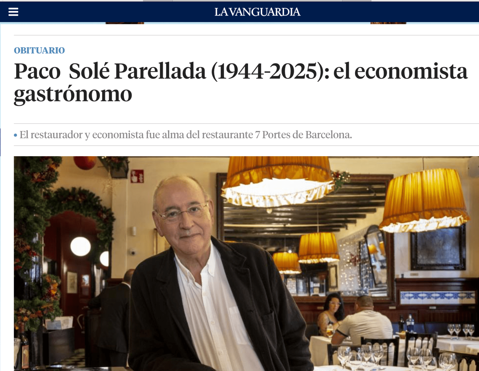 .El reciente fallecimiento de Françesc Solé Parellada (mira este artículo de hace diez años) nos hace recordar la importancia que esta personalidad tuvo en la concepción y el empuje de la citada fundación y en la formación de gestores universitarios, sin mencionar el maravilloso impulso de su centenario restaurante 7 portas, donde tuve el privilegio de compartir magníficas sobremesas.