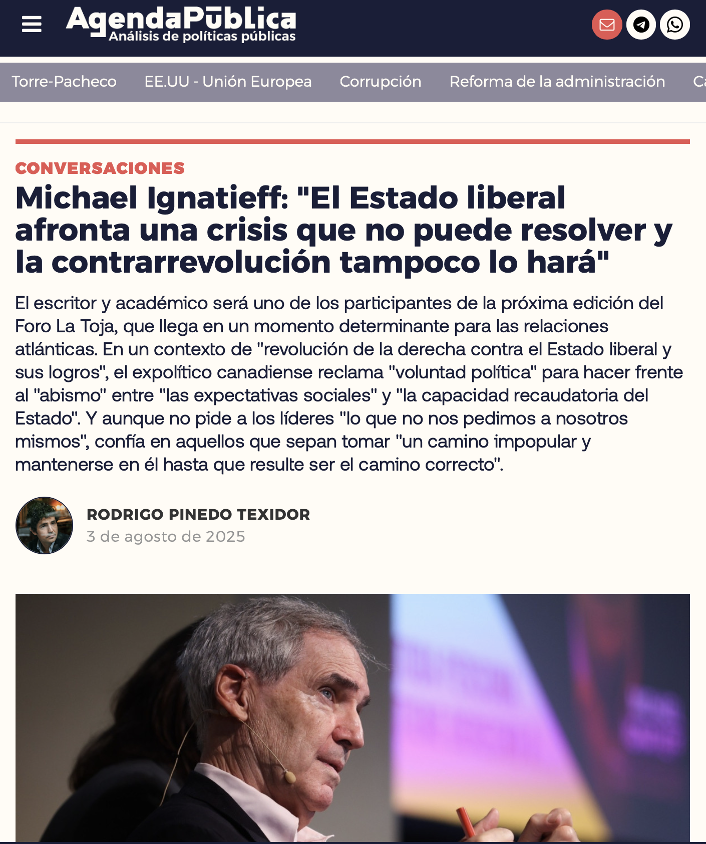 Michael Ignatieff, académico canadiense Premio Princesa de Asturias 2024 nos recuerda que el Estado de Bienestar está en crisis por “el abismo entre las expectativas sociales” de los europeos — en educación, sanidad, bienes públicos, ocio— y la capacidad recaudatoria. Durante los últimos años de crecimiento continuo se ha afrontado “podando el Estado liberal para hacerlo más eficiente y aumentando la carga fiscal sobre la clase media”, nos dice. Todas las sociedades —Canadá, Francia, España— se enfrentan a este problema que no pueden resolver sin voluntad política y desgaste. Su esperanza es que la gente piense: «No, no quiero poner en peligro tantos logros. Quiero legárselos a mis hijos» y acepte los ajustes frente a la demagogia.